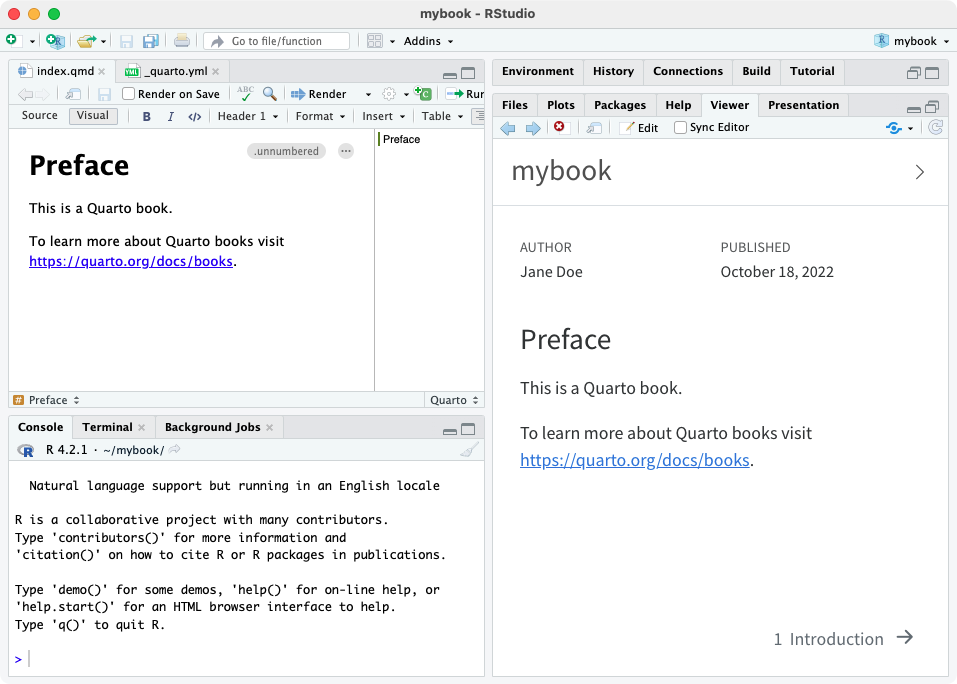 quarto preview mybookThe book preview will open in a new web browser. As you edit and save index.qmd (or other files like intro.qmd) the preview is automatically updated.