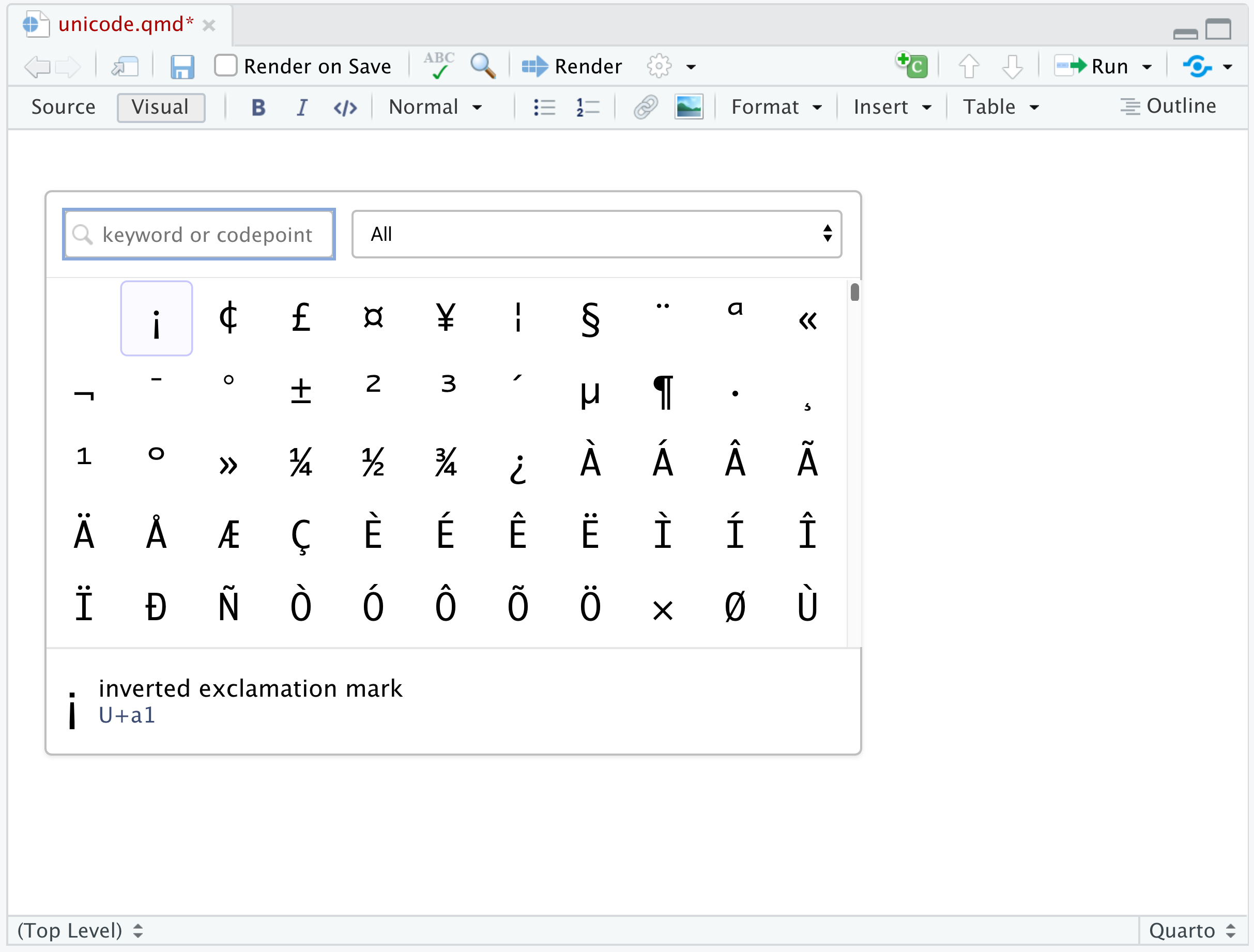 Visual mode supports editing all of Pandoc markdown. Standard formatting commands (headings, bold, italic, etc.) work just the way they do in a conventional word processor.